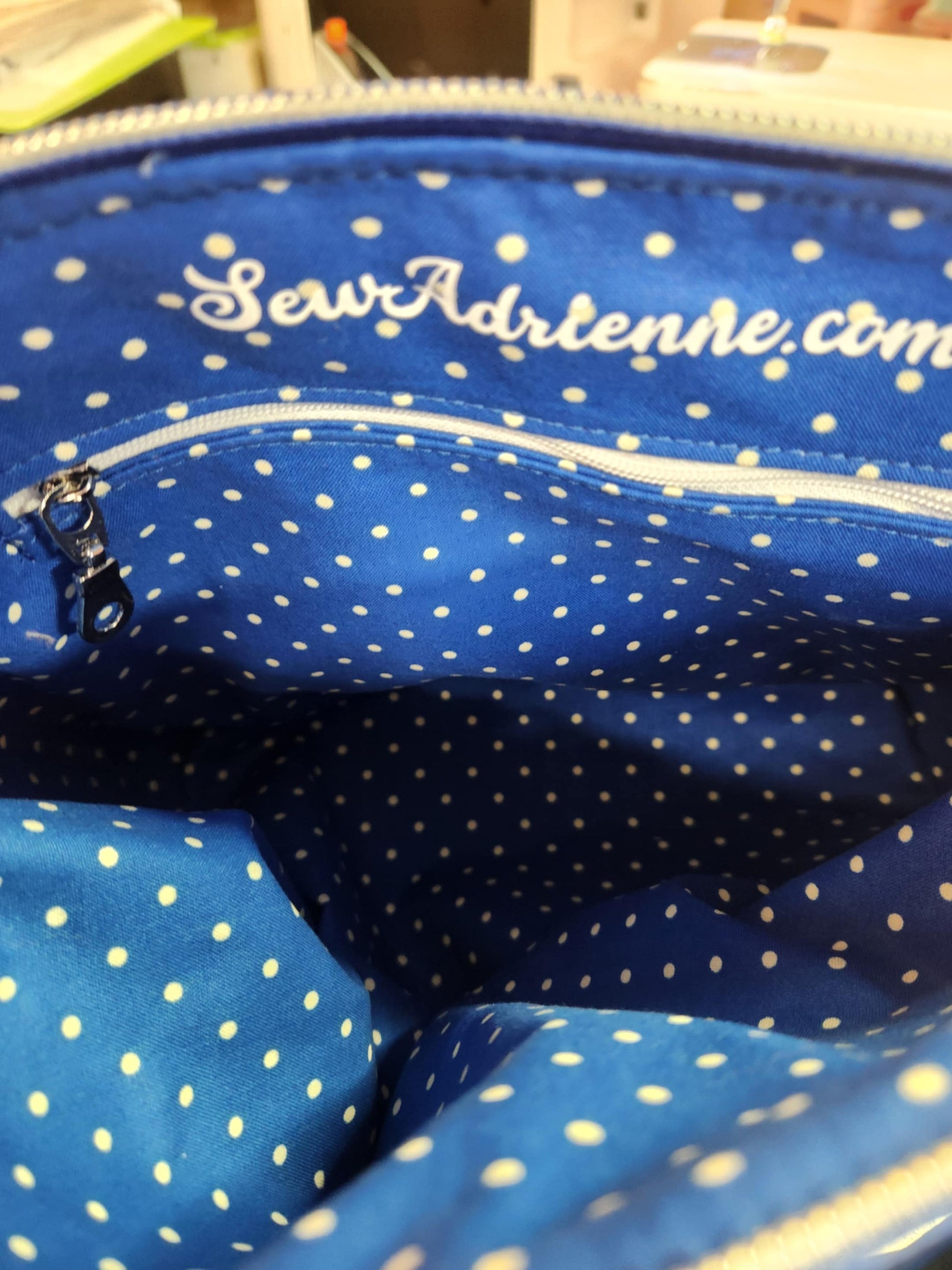The main fabric of the bag features a delightful cotton print while the coordinating fabric is made of premium marine vinyl. To enhance its durability and structure, the bag is fully foam interfaced, and its interior is lined with a delightful cotton print. Inside, you'll find a convenient zippered pocket.