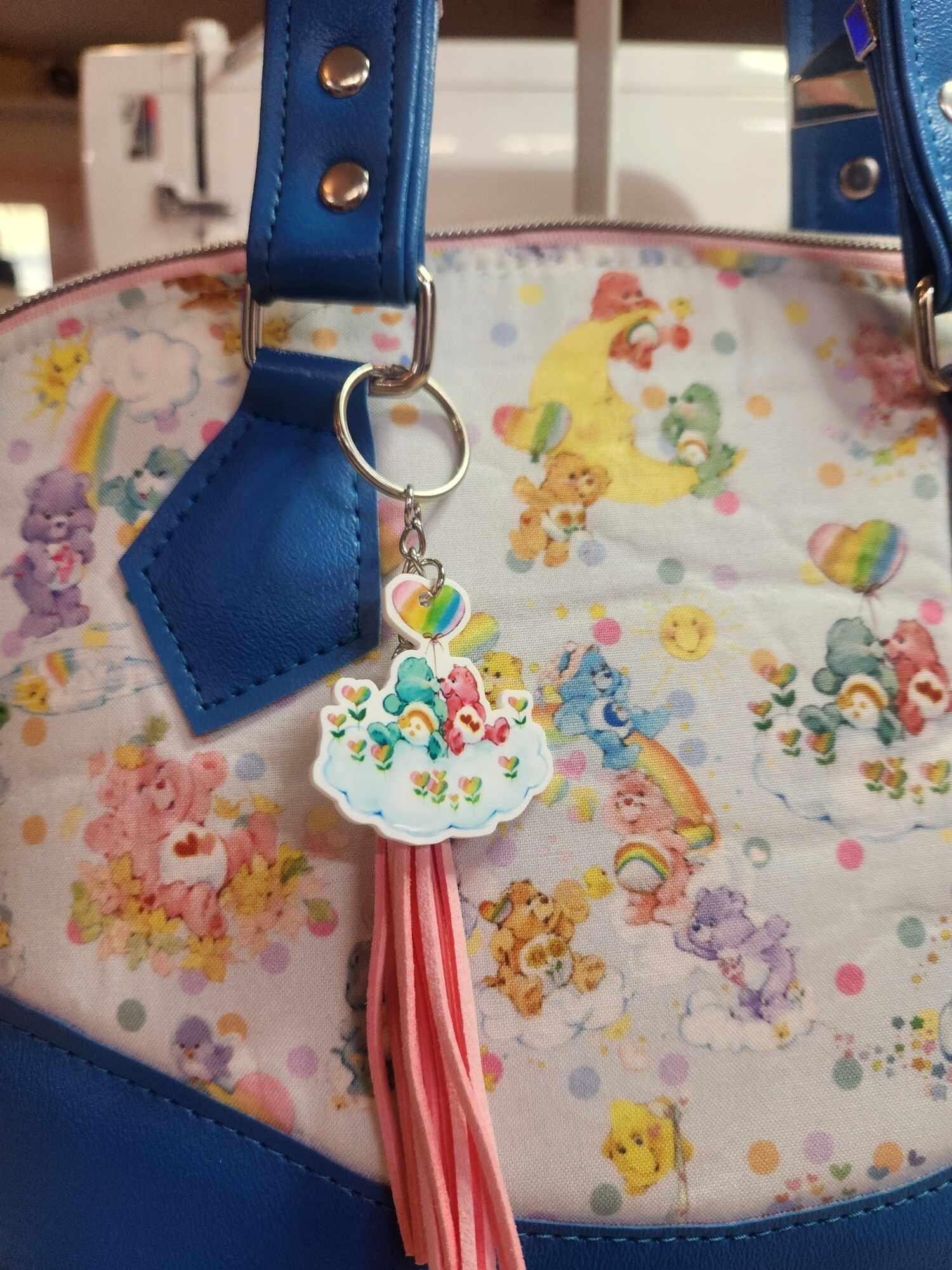 Introducing a delightful themed handbag, meticulously crafted to order. This unique purse combines a custom-made fabric featuring characters with vibrant vinyl accents.