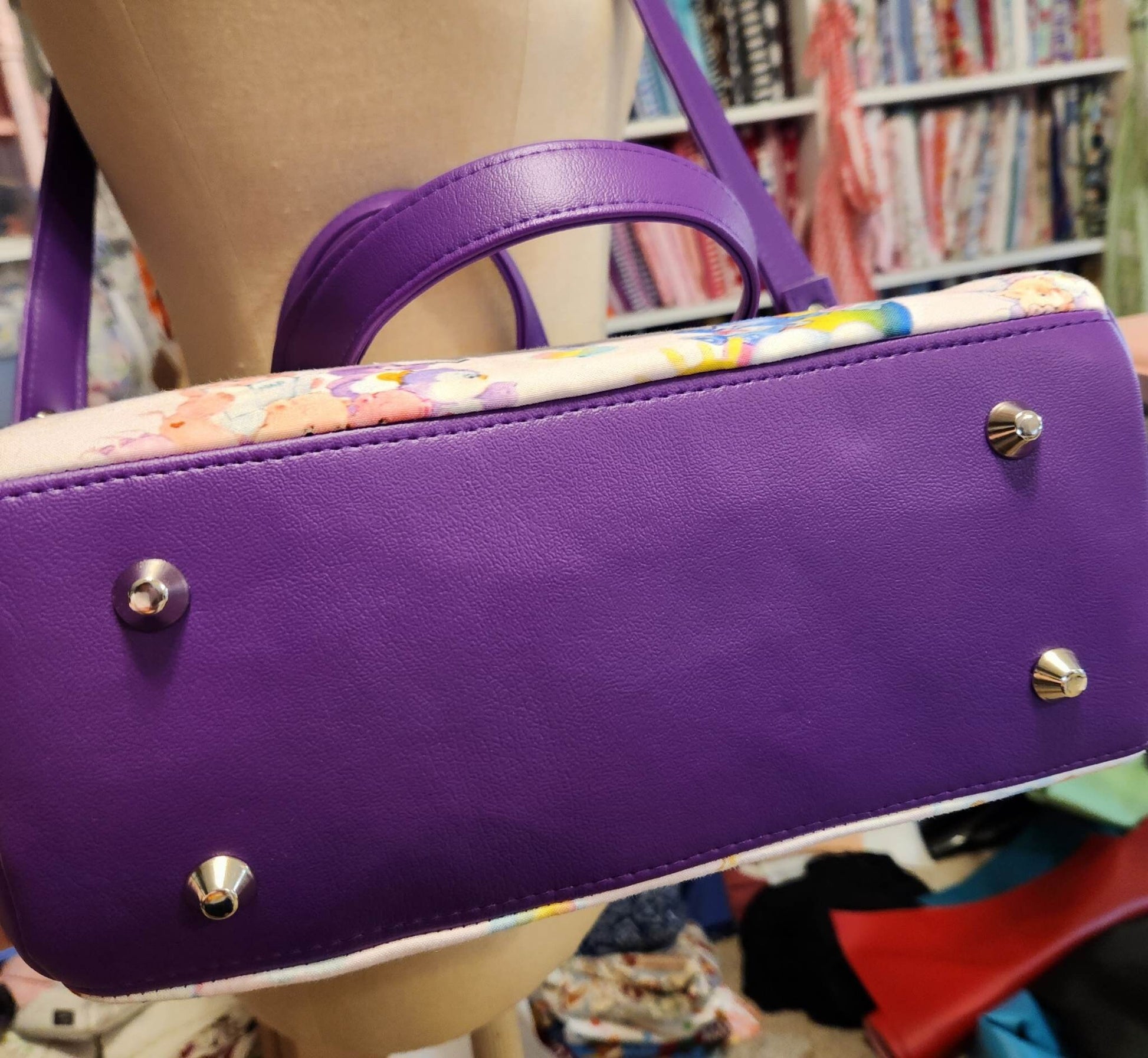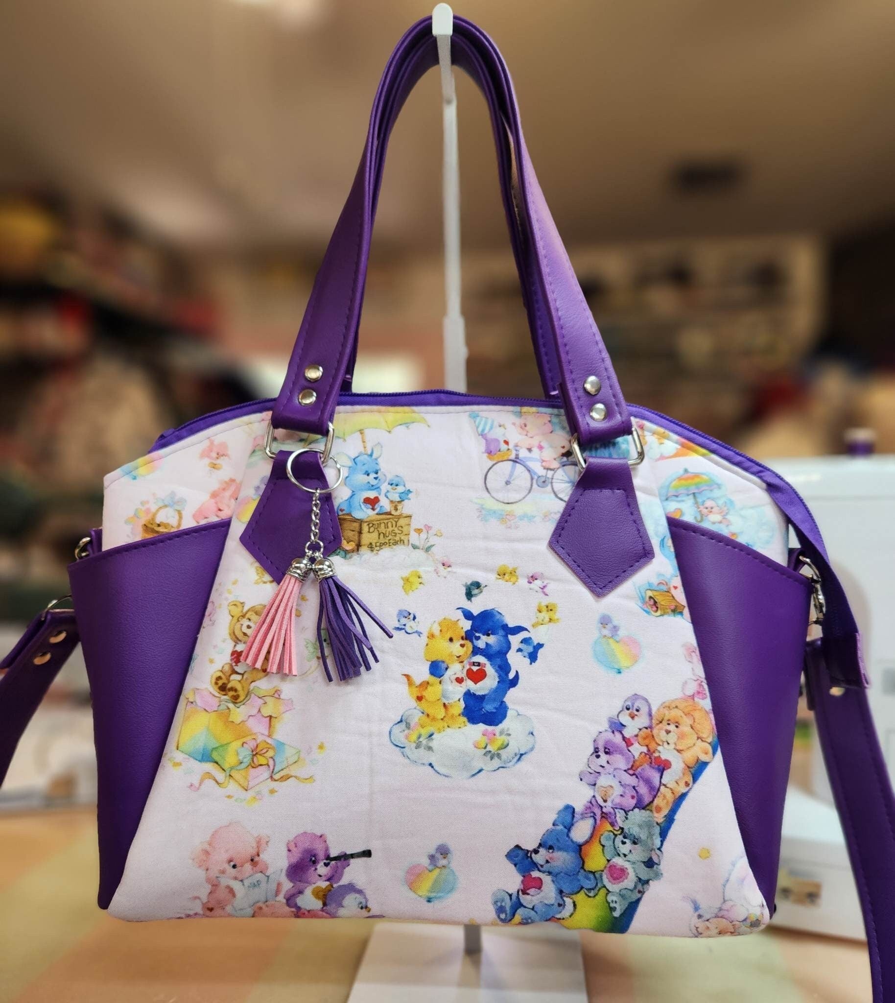 Please note that this handbag is made to order, and the fabric placement may vary slightly. However, rest assured that the main fabric depicted in the picture will remain consistent, showcasing the enchanting Classic 80's Care Bear Cousins design. While coordinating fabrics and charms for the zipper pulls may be substituted, their overall impact on the bag's appearance will be unaffected, maintaining the charm and uniqueness of your custom creation.