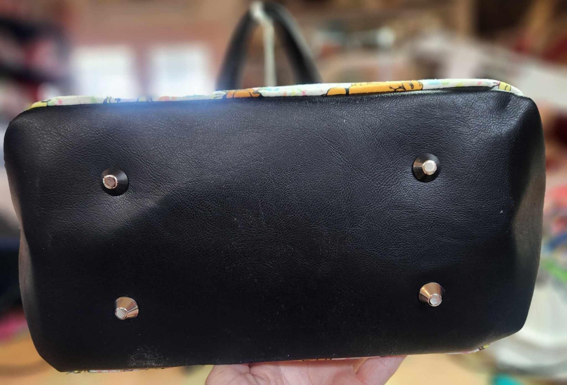 The main fabric of the bag features a delightful cotton print showcasing characters, while the coordinating fabric is made of premium marine vinyl. To enhance its durability and structure, the bag is fully interfaced, and its interior is lined with a delightful dotted cotton print. Inside, you'll find a convenient zippered pocket and a handy divided slip pocket.