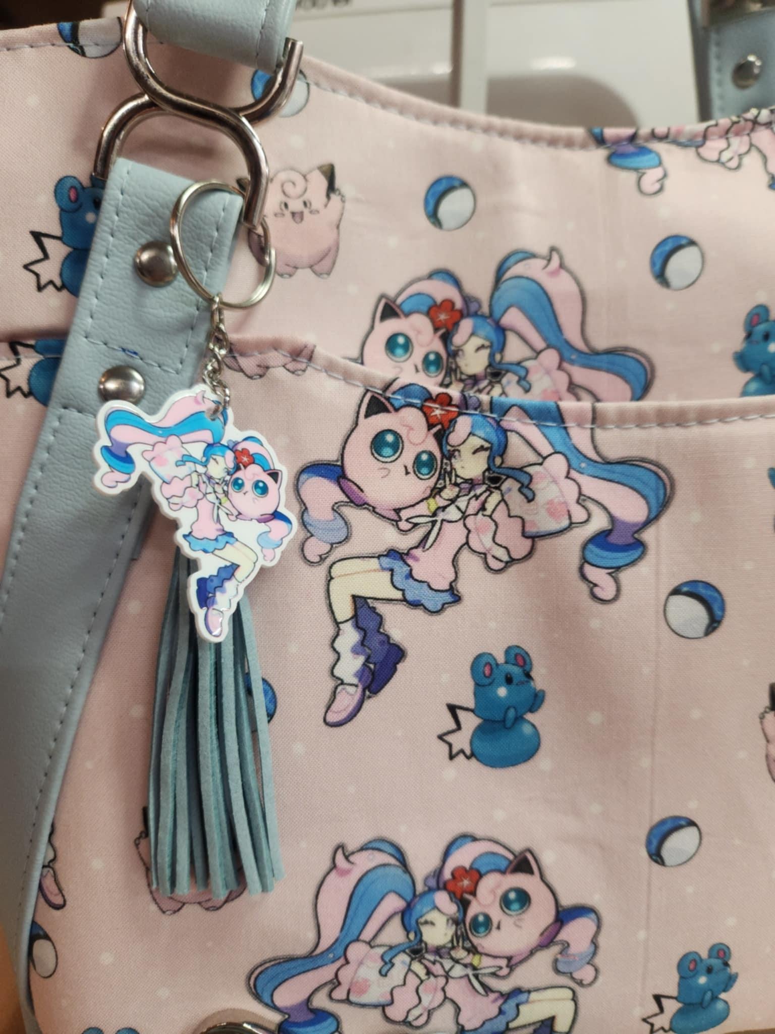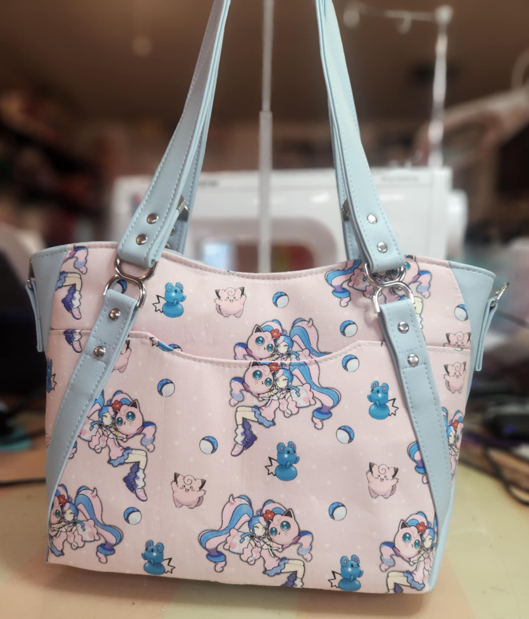 Introducing a delightful Miku Pokemon handbag, meticulously crafted to order. This unique purse combines a fabric featuring charming graphics with vinyl accents. This handbag is a testament to the utmost attention given to every detail, ensuring a high-quality accessory that you'll proudly carry.