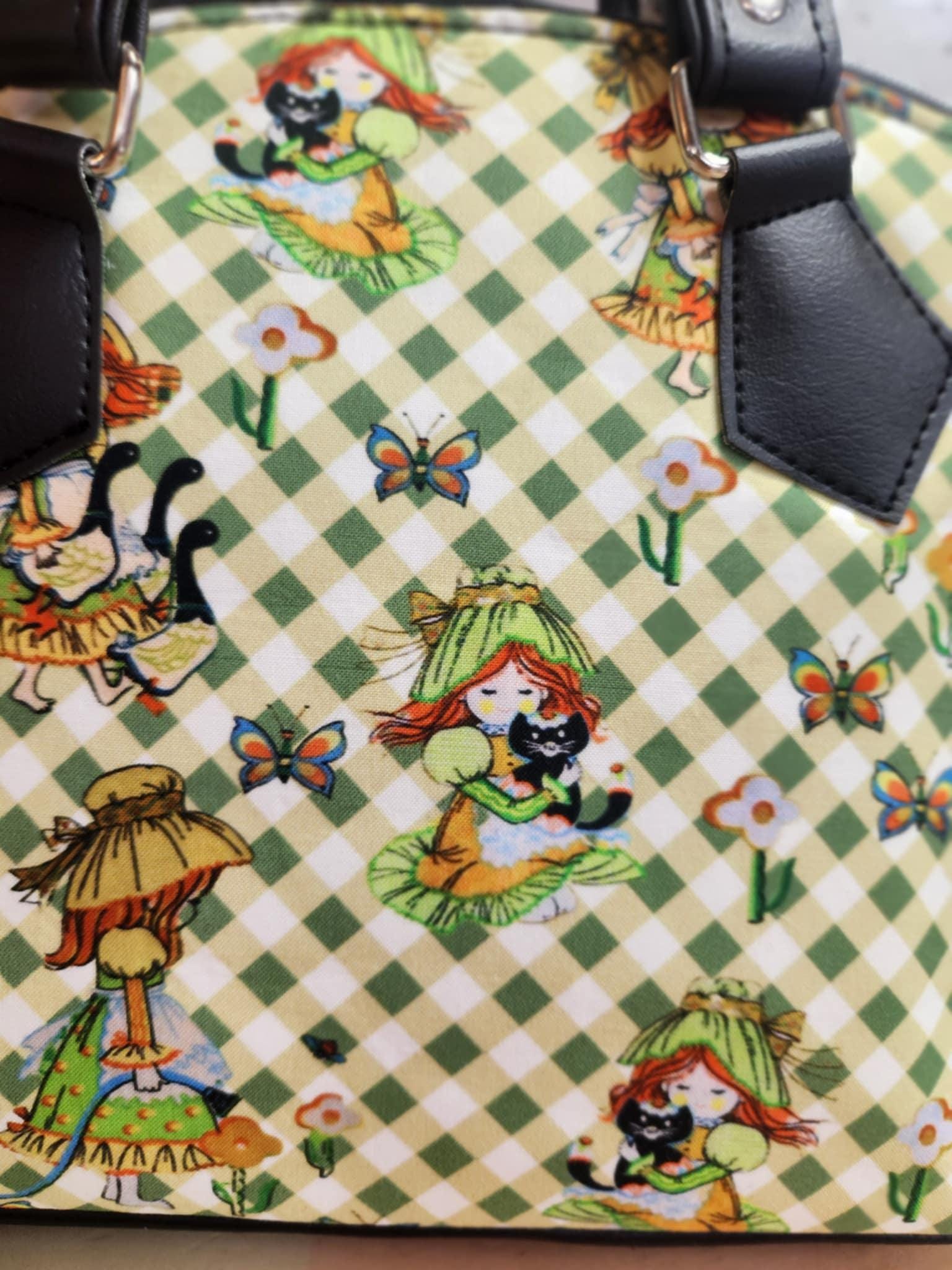 The main zipper securely closes the bag. Additionally, the front zipper boasts a playful vinyl overlay. This handbag is an absolute must-have for any fan of the beloved character. Embrace your love for nostalgic Sears Katie's Patchwork with this perfect accessory!