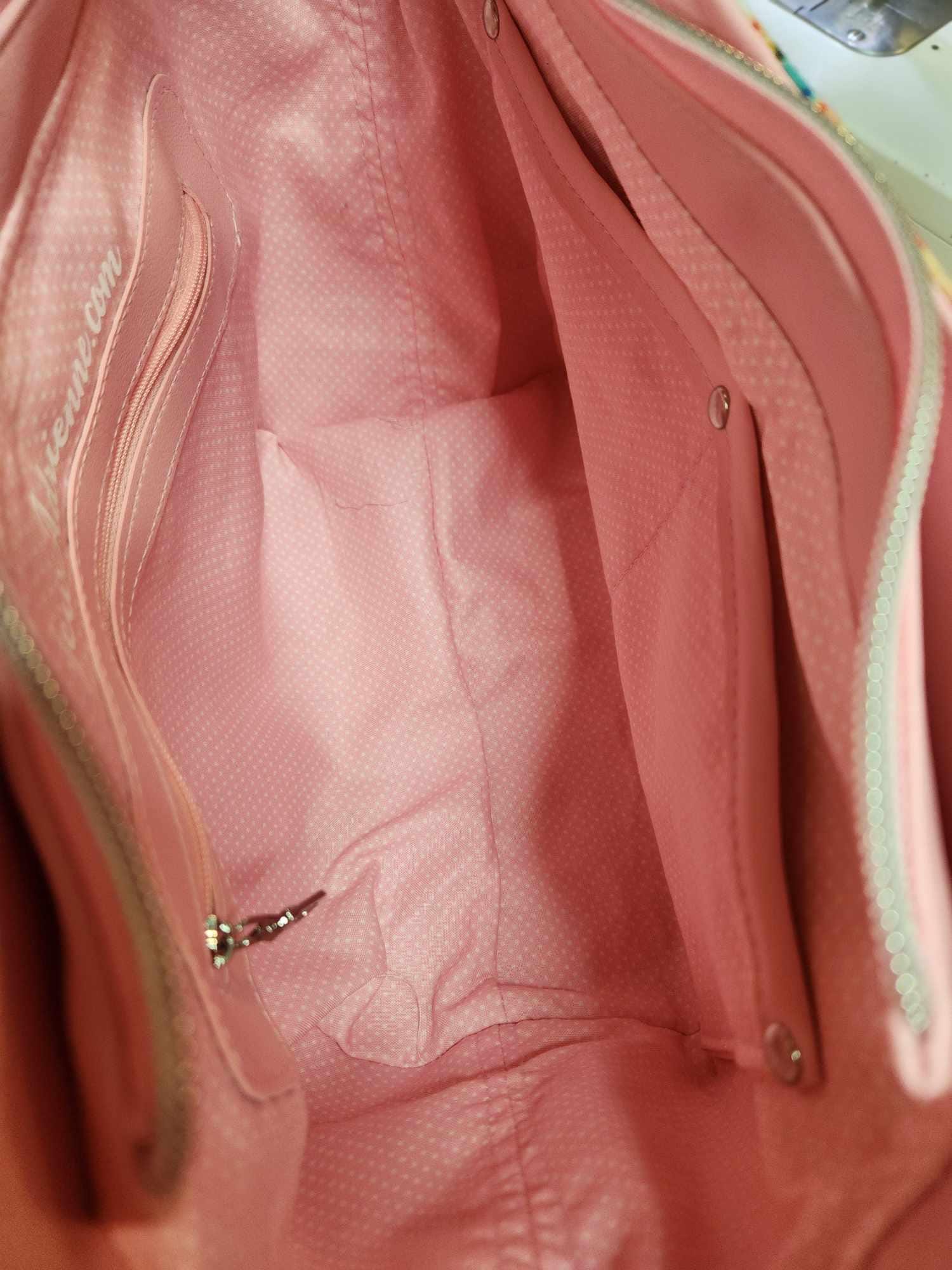 The main fabric of the bag features a delightful cotton print showcasing the lovable graphics from vintage baby animal decals, while the coordinating fabric is made of premium marine vinyl. To enhance its durability and structure, the bag is fully interfaced, and its interior is lined with a delightful dotted cotton print. Inside, you'll find a convenient zippered pocket and a handy divided slip pocket.