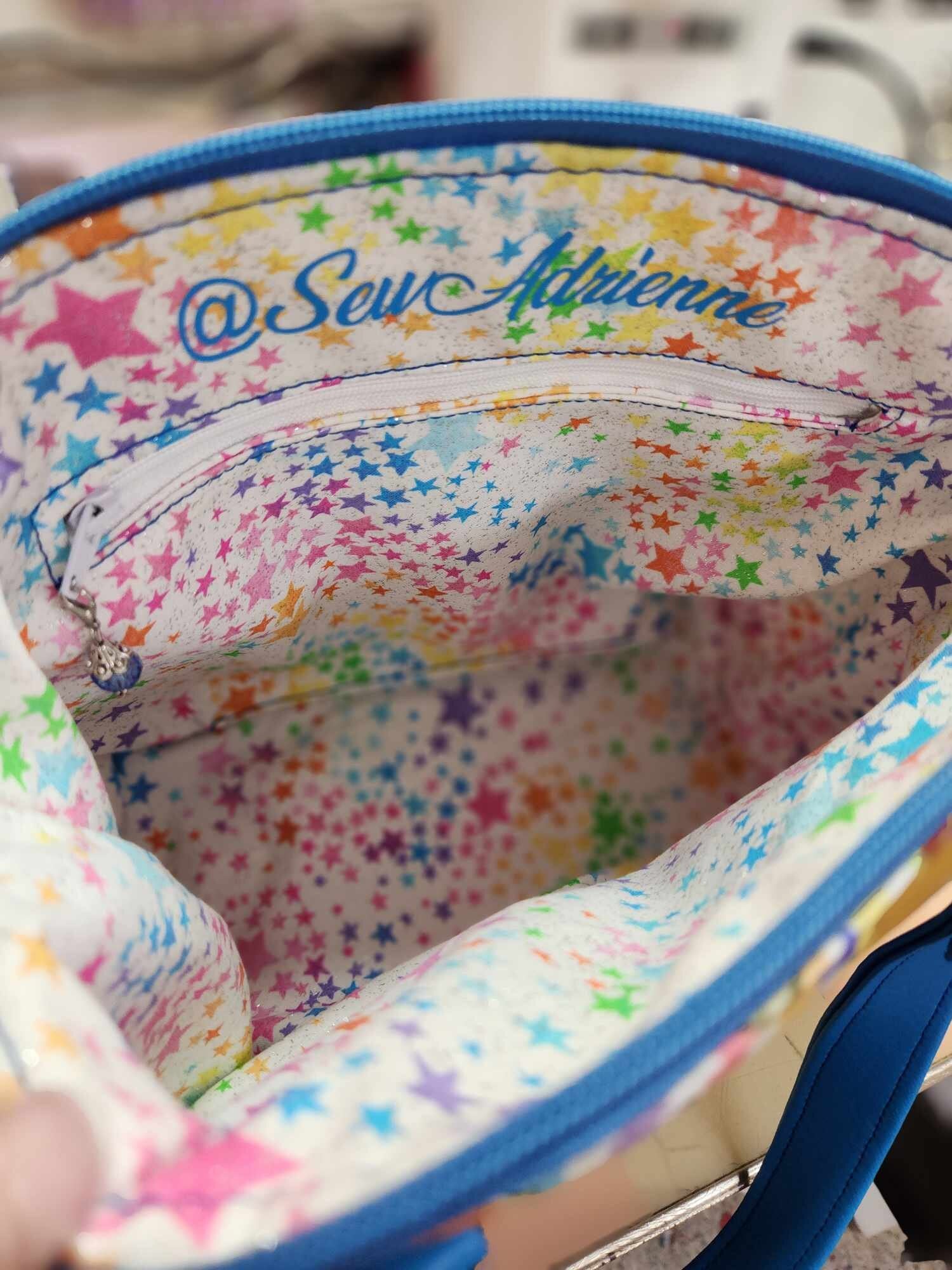 The main fabric of the bag features a delightful cotton print while the coordinating fabric is made of premium marine vinyl. To enhance its durability and structure, the bag is fully foam interfaced, and its interior is lined with a delightful cotton print. Inside, you'll find a convenient zippered pocket.