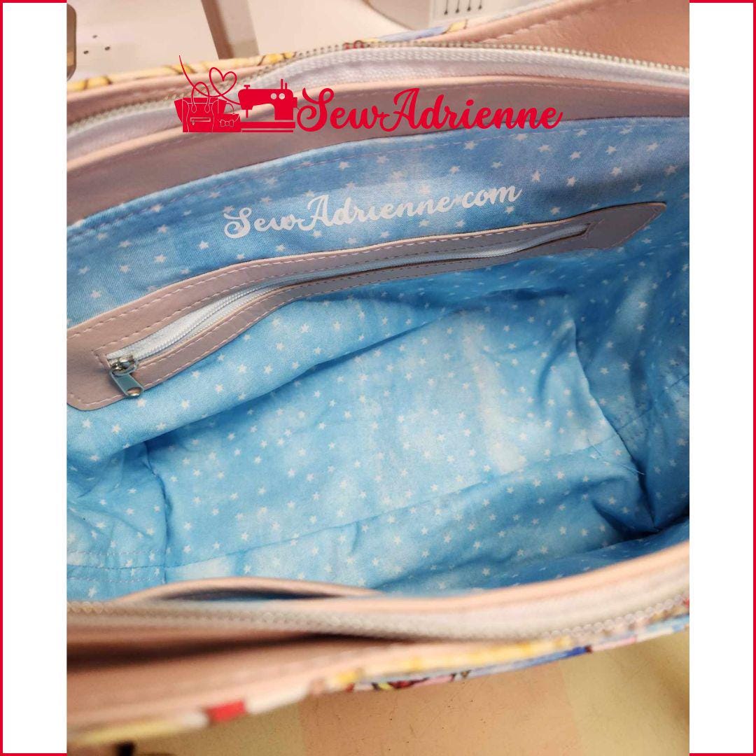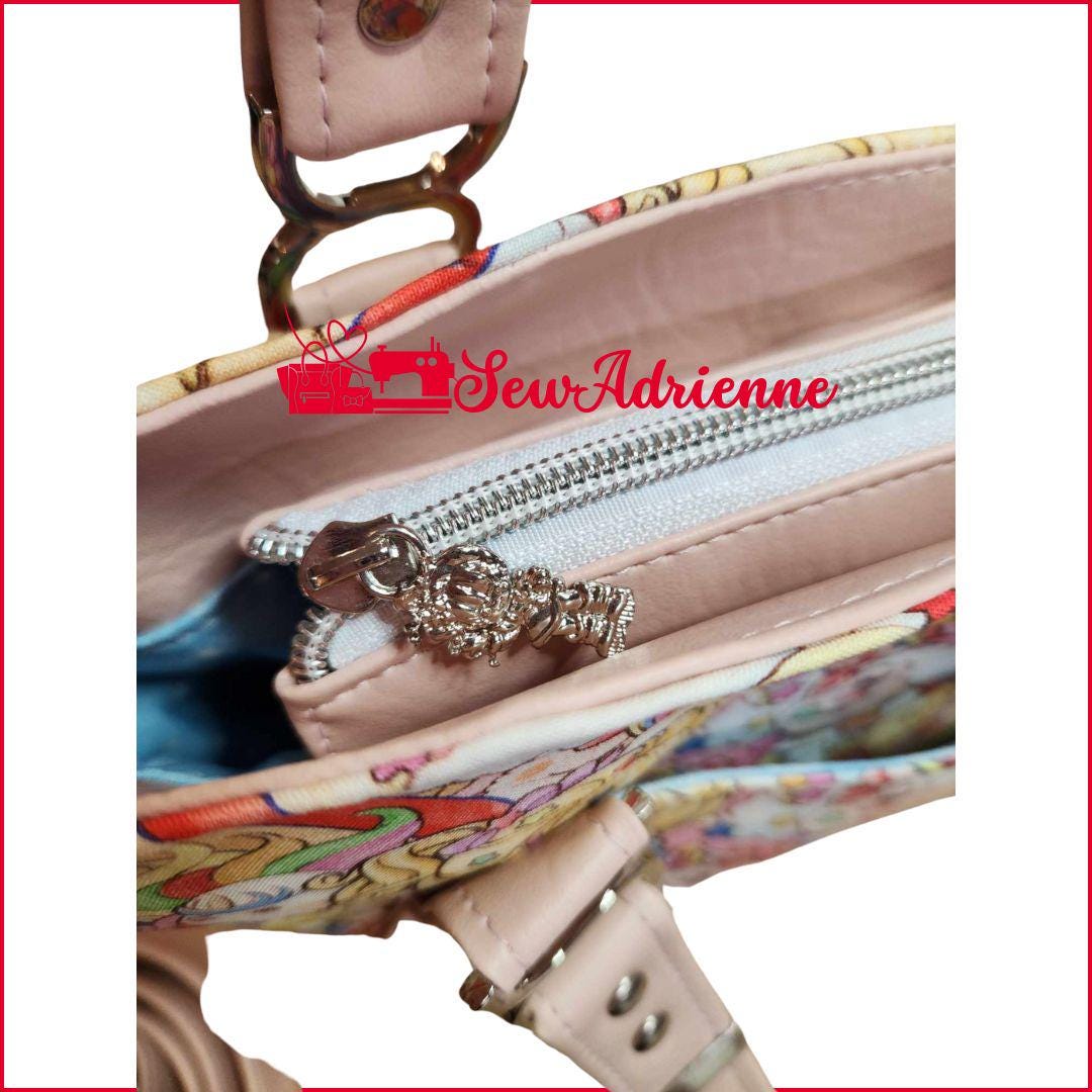 The main fabric of the bag features a delightful cotton print, while the coordinating fabric is made of premium marine vinyl. To enhance its durability and structure, the bag is fully interfaced, and its interior is lined with a delightful cotton print. Inside, you'll find a convenient zippered pocket and a handy divided slip pocket.