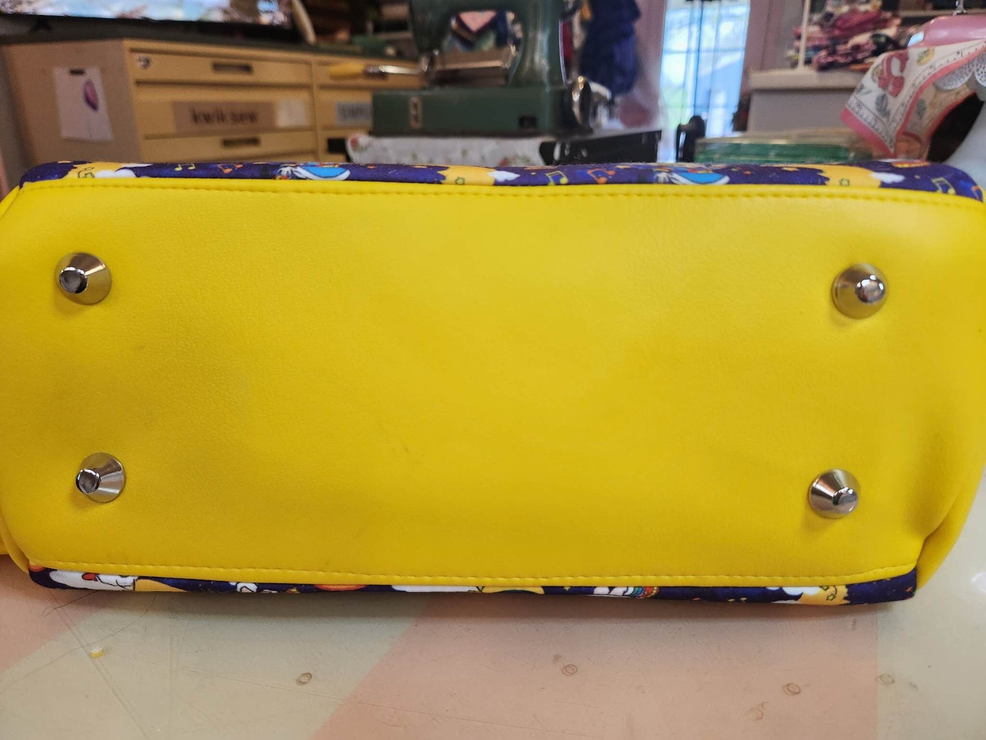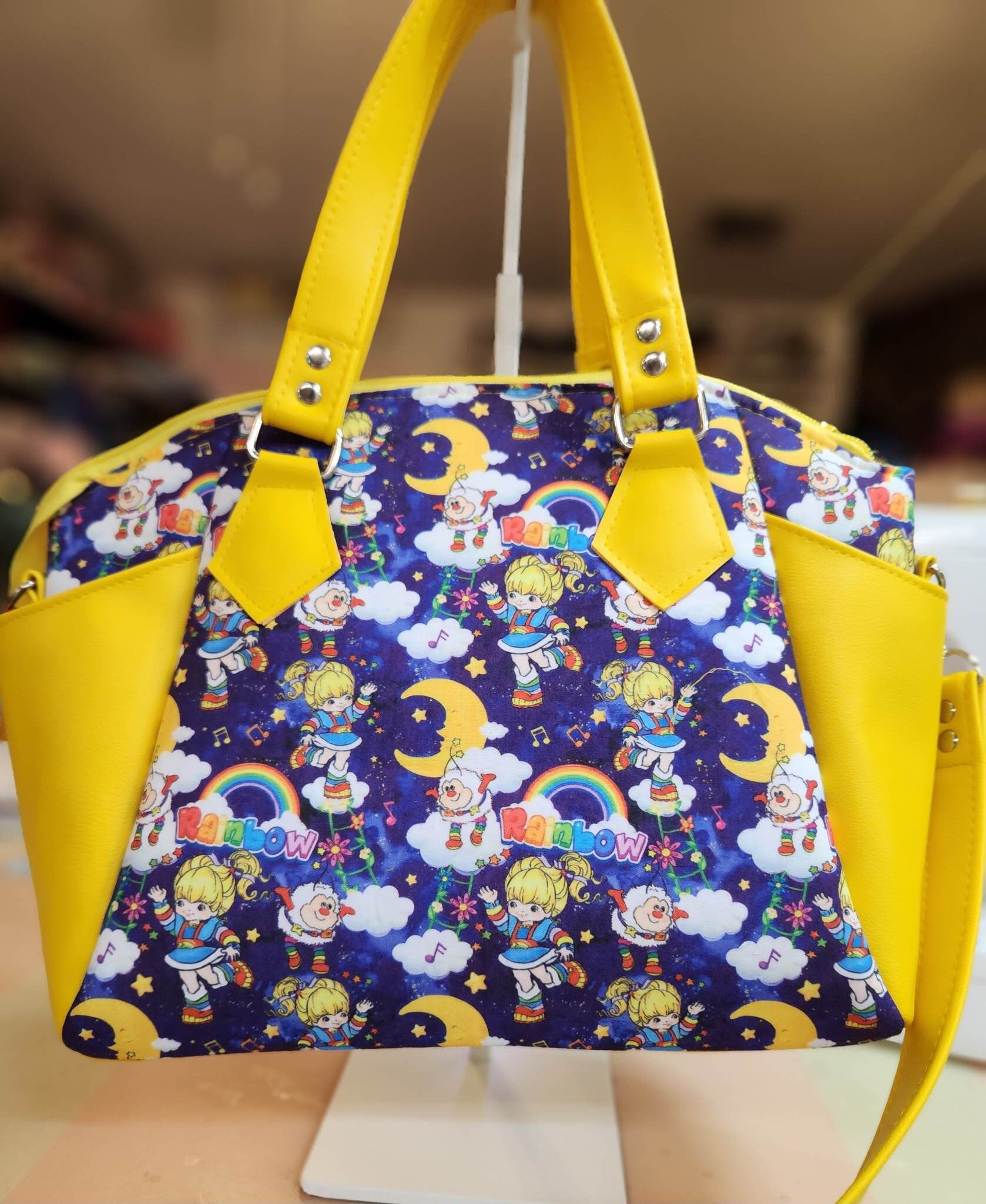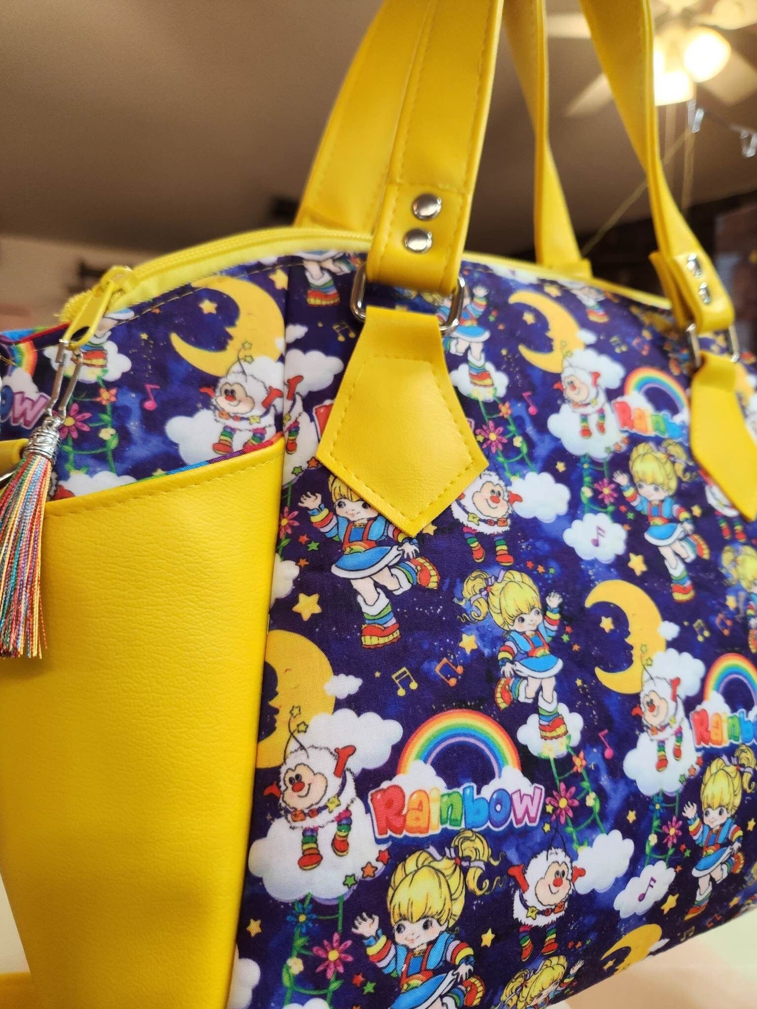 The main fabric of this lovely handbag is made of premium cotton, showcasing a delightful vintage-inspired print featuring Rainbow Girl and her friends. The coordinating fabric is crafted from high-quality marine vinyl, adding a touch of sophistication. The bag is fully interfaced and lined with a vibrant rainbow-striped cotton fabric, guaranteeing durability and a charming interior.