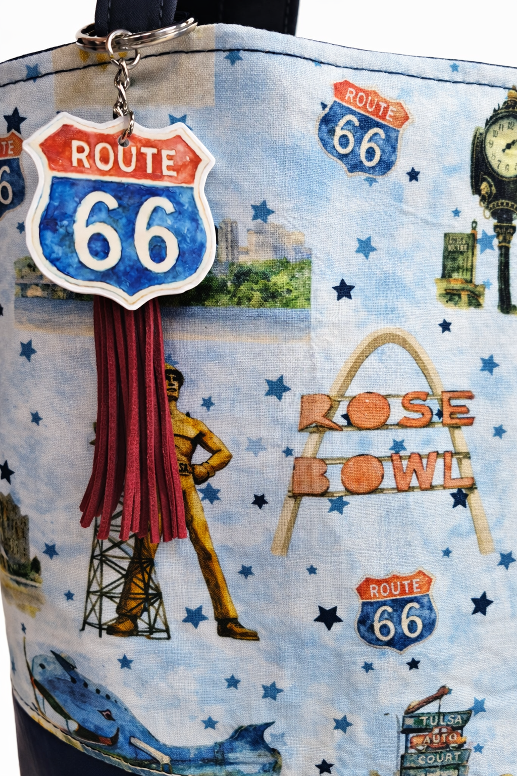 Route 66 will soon be celebrating it's 100th Anniversary! Tulsa Oklahoma is a integral & beloved stop along the iconic stretch of America's Highway! What better way to celebrate than with this amazing tote bag featuring Tulsa icons?! Including the Golden Driller, Church Studio, Rose Bowl, Tulsa Skyline, Tulsa Flag, Route 66 Sign, and others!