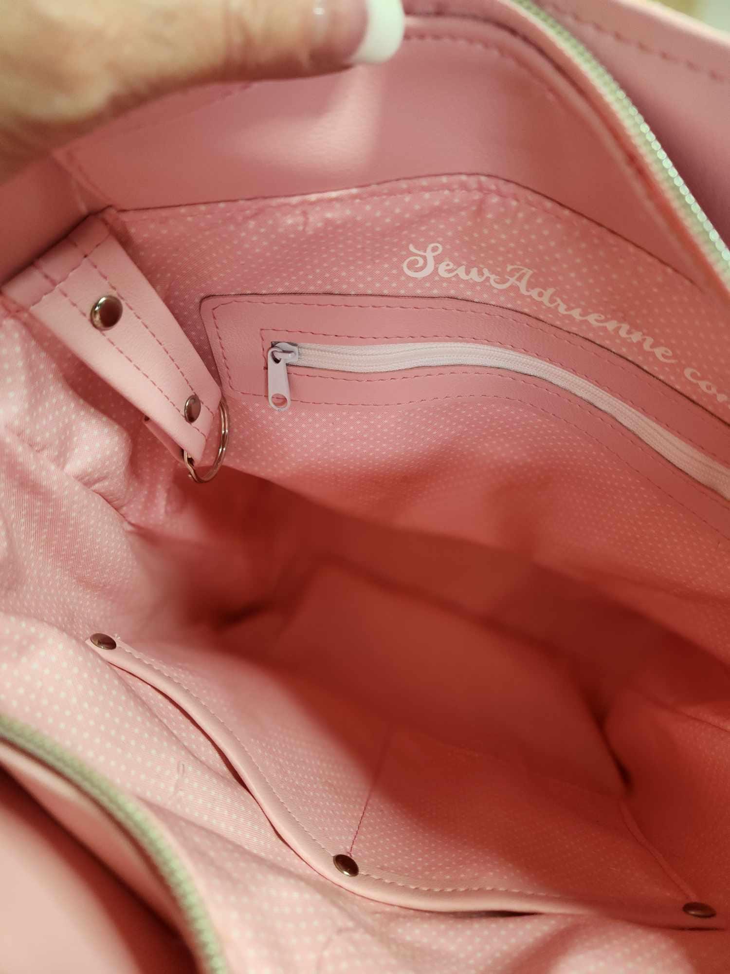 The main fabric of the bag features a delightful cotton print while the coordinating fabric is made of premium marine vinyl. To enhance its durability and structure, the bag is fully interfaced, and its interior is lined with a delightful dotted cotton print. Inside, you'll find a convenient zippered pocket, a handy divided slip pocket, and an attached keychain to clip your keys on. The main zipper, designed with a charming zipper pull, securely closes the bag.
