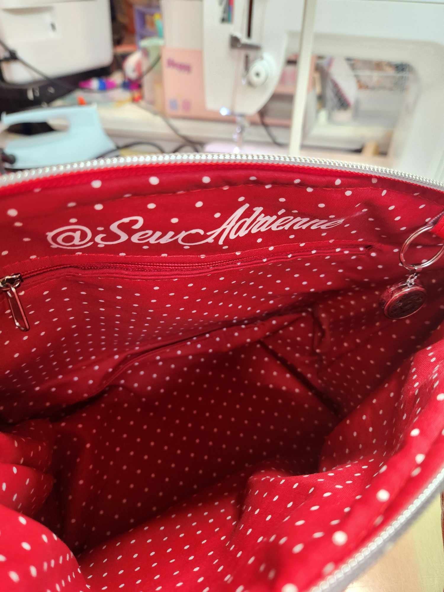 The main fabric of the bag features a delightful cotton print while the coordinating fabric is made of premium marine vinyl. To enhance its durability and structure, the bag is fully foam interfaced, and its interior is lined with a delightful red dotted cotton print. Inside, you'll find a convenient zippered pocket.