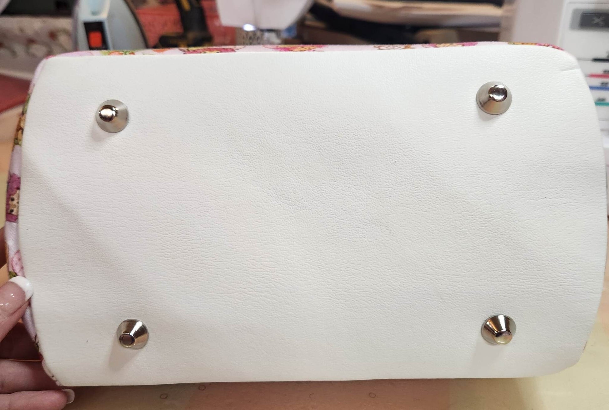 Introducing a delightful themed handbag, meticulously crafted to order. This unique purse combines a custom-made fabric featuring characters with vibrant vinyl accents.