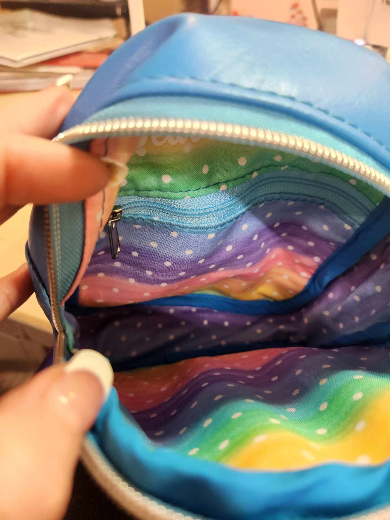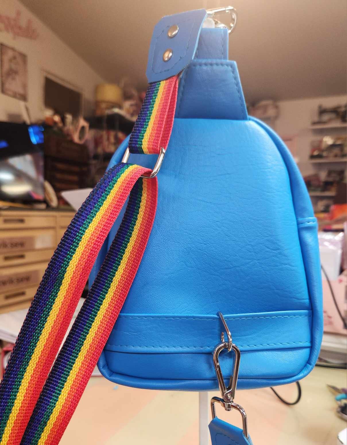The front of the backpack showcases a sublimated print of the lovable Bear, while the main fabric proudly displays an enchanting pattern. To enhance durability and style, I carefully selected high-quality marine vinyl for the coordinating fabric. The bag is fully interfaced and lined with a vibrant rainbow print adorned with stars. Inside, you'll find a convenient zipper pocket for additional storage.